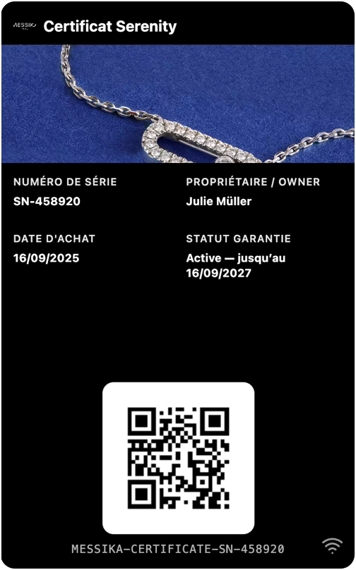 Il contient les informations clés : date d’achat, référence produit, boutique, authenticité. En cas de revente, de réparation ou de contrôle, le client peut présenter ce certificat en un geste.