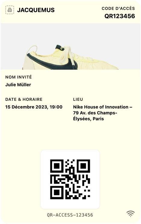 L'invitation privée est peut-être l'usage le plus puissant. Lancement de collection, vernissage, événement VIP. L'invitation arrive directement dans le wallet du client. Elle est individuelle, sécurisée, fluide et moderne.